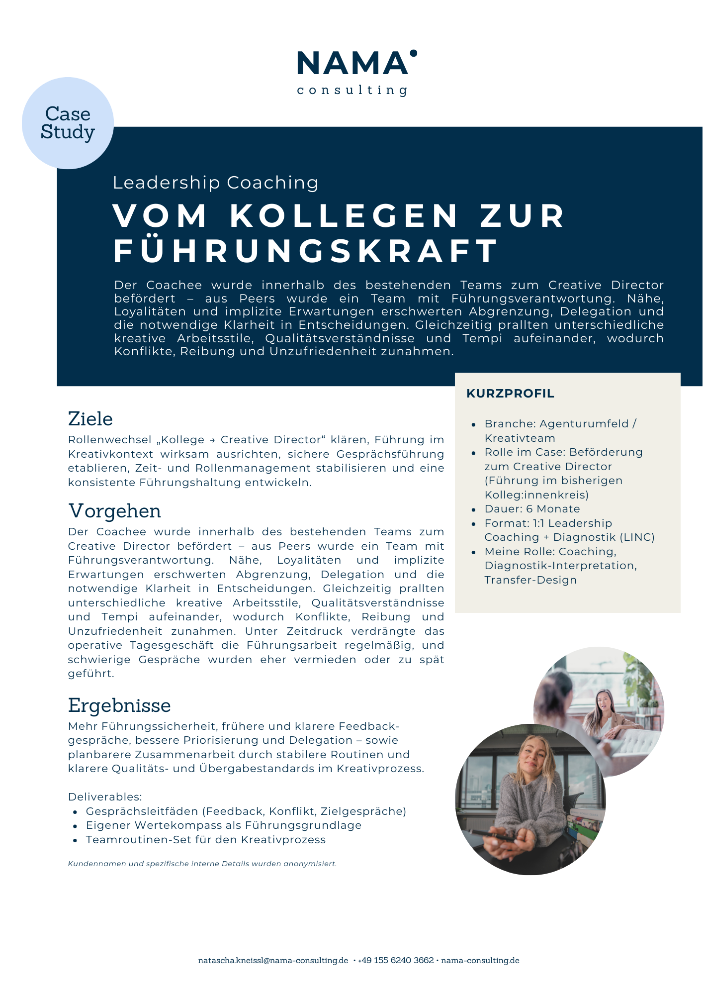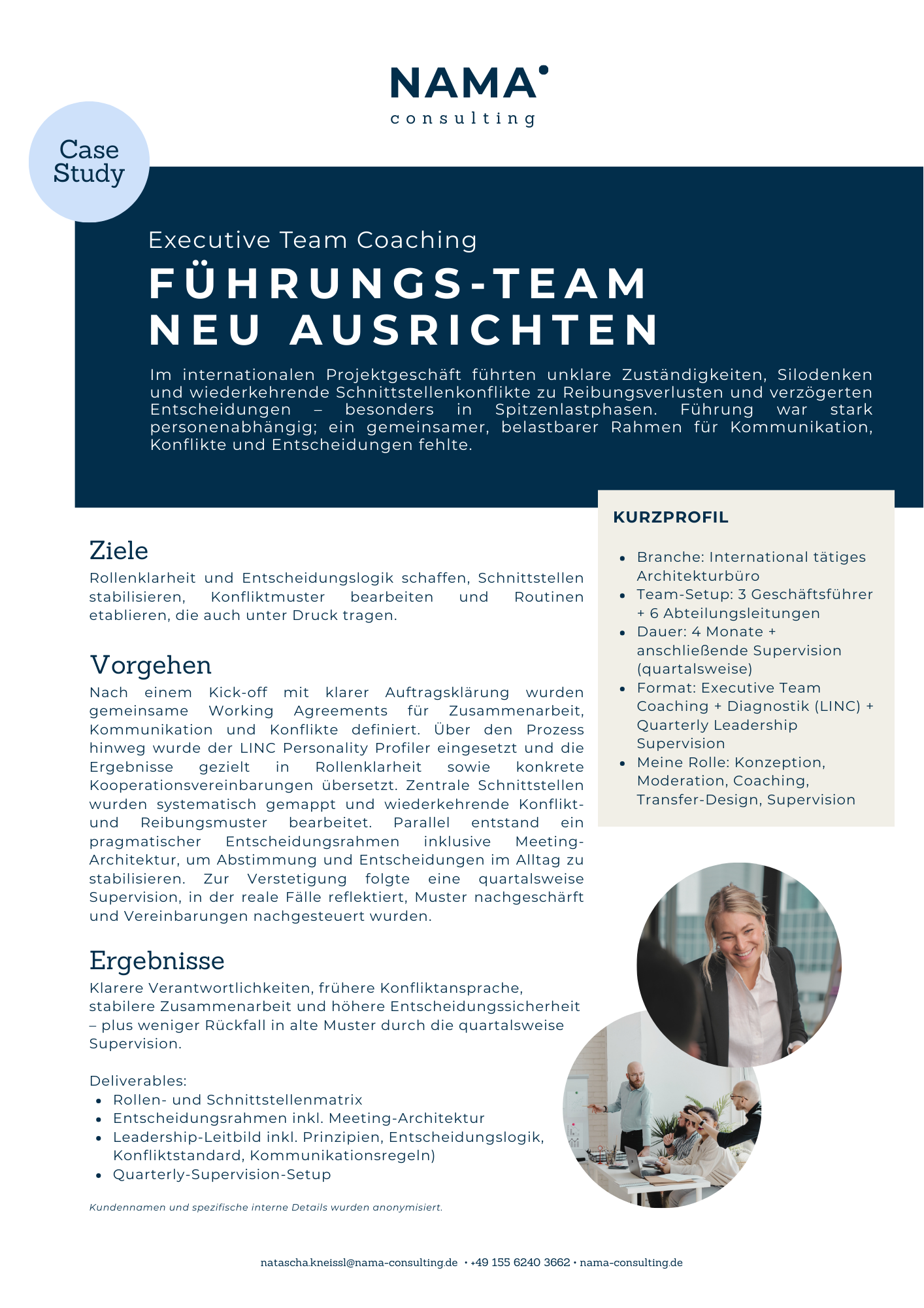 Ausgewählte Case Studies aus meiner Arbeit als Executive Team Coach, Leadership Coach und Strategieberaterin zeigen, wie aus typischen Spannungsfeldern im Projekt- und Kreativgeschäft konkrete Fortschritte entstehen: mehr Rollen- und Entscheidungsklarheit, konstruktivere Konfliktbearbeitung, bessere Zusammenarbeit und ein Transfer, der im Arbeitsalltag trägt.